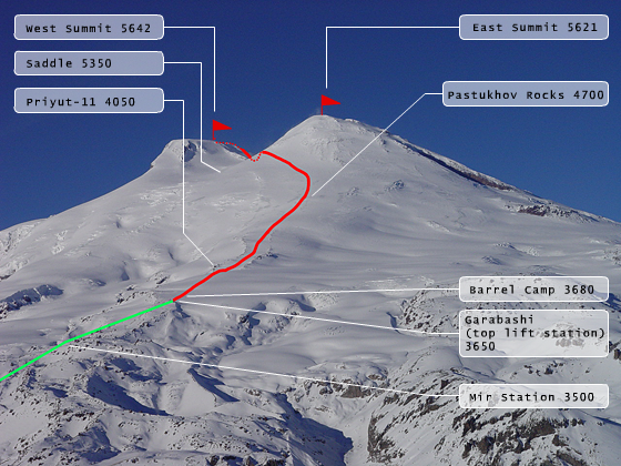| Acclimatization hike to Pastukhov Rocks (Monday) | After breakfast, we hiked up to the Pastukhov Rocks (4700 m, 1000 vm, 4 hours). Overnight at the camp at 3700 m again. The weather was again excellent with very high temperatures. | |||||||
