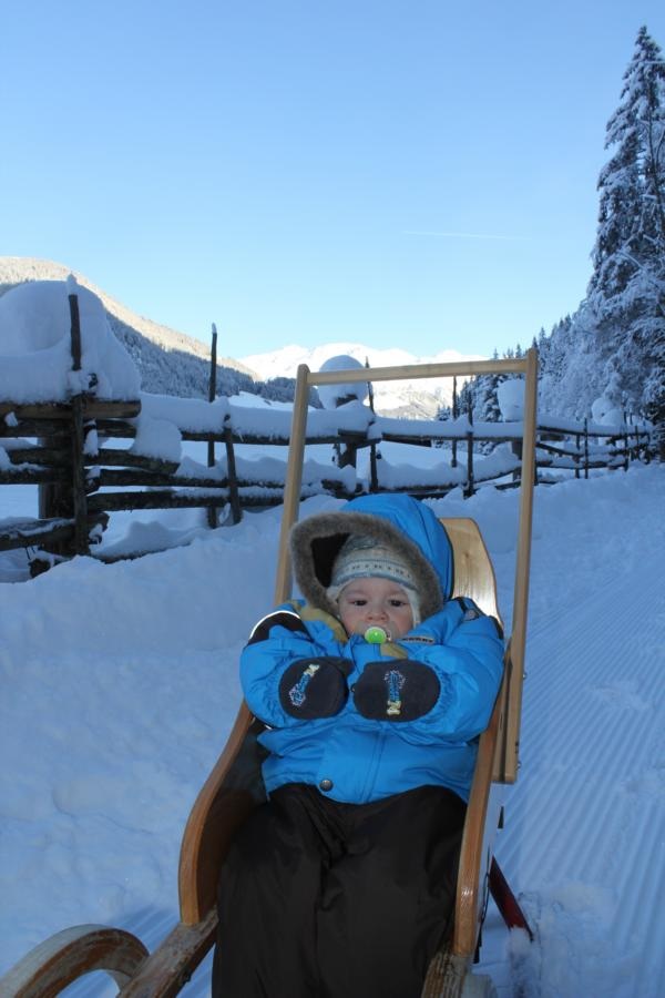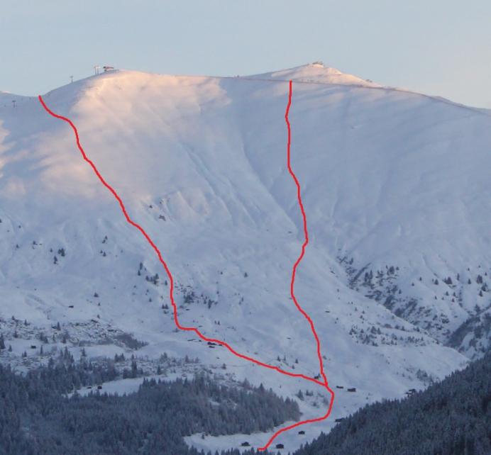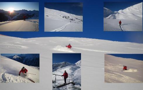 2011/2012 year's New Year skiing was one of the best in years. More than a full meter of fresh powder had arrived and despite not ideal weather conditions we had several days of great off piste skiing. Due to the high avalanche level some of the best runs couldn't be skied (like the right red line below) however great "forest" runs and one of my favorite slopes (left red line below) from 2400m down to 1300m with a vertical drop of more than 1100m to the Rastkogelbahn was again a great experience. The Bergland Hotel we stayed in took very much care of our little Franz and as usual we were highly satisfied. Below you can find a selection of the best pics including my big favorite run...: